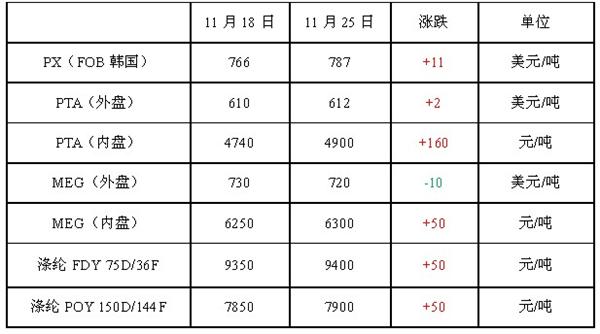 本周原油价格涨跌互现,基于市场仍对月底OPEC会议减产存预期,原油价格大幅跳涨,然而随后美元汇率飙升,抵消了原油冻产预期带来的利好,国际原油震荡为主。周四(11月24日)纽约商品交易所休市,在电子盘交易中,纽约商品交易所轻质原油1月期货在每桶47.80-48.26美元范围内交易;伦敦洲际交易所布伦特原油2017年1月期货结算价收于每桶49美元。 PX方面,本周国内PX市场价格走势震荡,场内对二甲苯装置运行平稳,国内开工率维持6成左右,PX货源供应正常,近期PX的行情走势仍多受原油价格震荡的影响,截至本周四,亚洲PX价格收于786.5美元/吨FOB韩国和806.5美元/吨CFR中国;欧洲PX收于713美元/吨FOB鹿特丹。