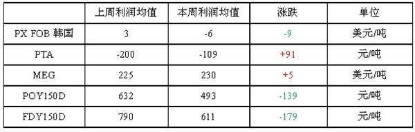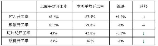 本周PTA周平均开工率在67.5%,较上周上升1.9%;实时开工率回升至69%(目前产能基数上升为4884万吨),如果去掉长期停产产能(1270万吨)的话,目前实时开工率在93.2%。聚酯方面,本周华润60万吨瓶片装置检修,故而聚酯周平均负荷略有下降至79.8%。目前织造开机率仍维持在8成偏上,但由于常规产品市场行情略有走弱,影响了整体开机的小幅回落。
