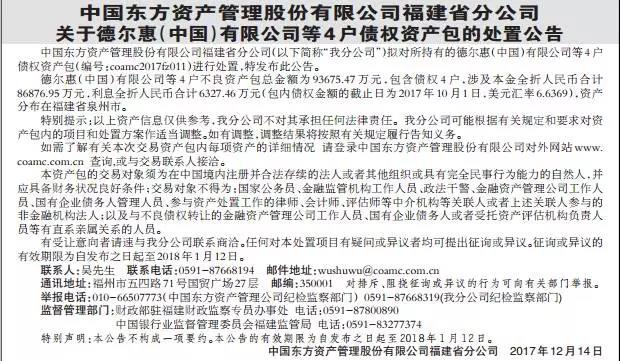 12月14日,中国东方资产管理股份有限公司福建省分公司在《福建日报》发布一则债权资产包的处置公告,涉及德尔惠有限公司、福建新亚集团有限公司、福建永胜进出口贸易有限公司等三家晋江企业。其中,新亚与永胜2家公司是关系企业。
