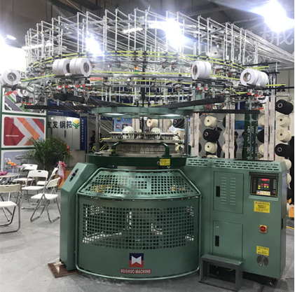 据了解,在这次纺机展上,除了推广传统针织大圆机以外,卜硕机械主要展示的是比较有特质的两款机台。首先一款是34寸*36针*84路,双面加氨纶的双面开幅针织大圆机。据吴总监介绍,以前由于市场上普通针织大圆机比较普遍,所以这款机器的市场占有率不是太高,但随着现今市场都向高帧率发展,这款机器的优势逐渐显示,更倾向于生产精细的面料产品。相信这是未来针织厂家发展的趋势,更具有潜力。