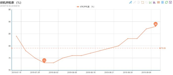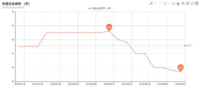 坯布库存:9月16日盛泽地区坯布织造库存为39-40天左右,个别厂家库存有所上升。织机开机率:9月16日盛泽地区喷水、喷气织机开机率在9成,厂家生产积极性较为稳定。