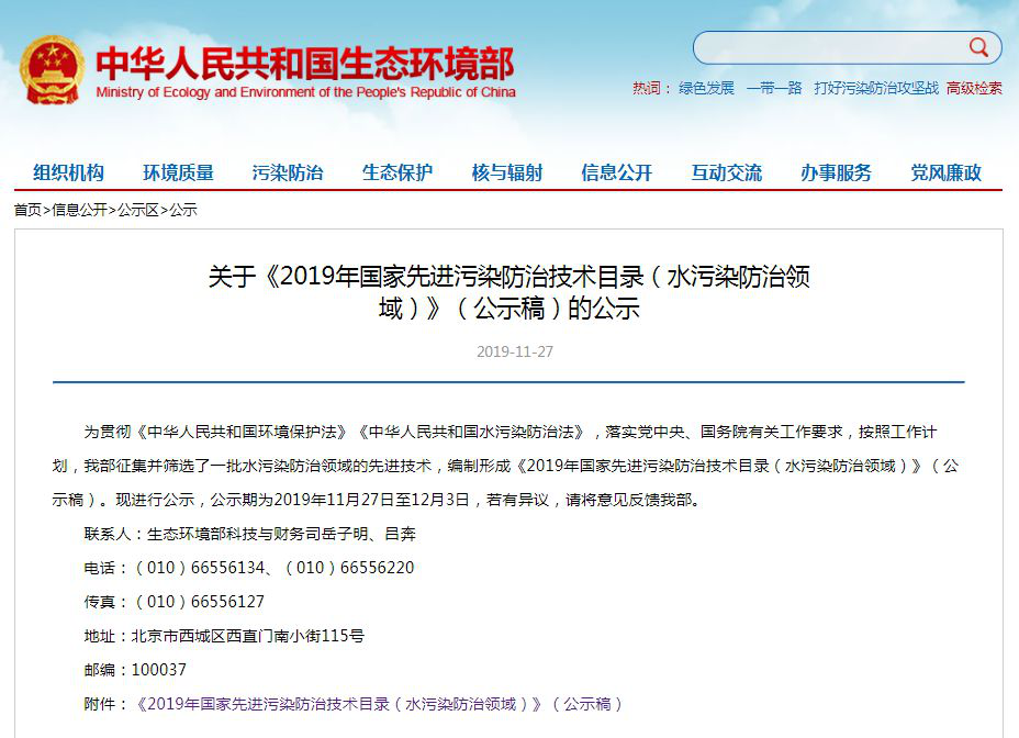 11月27日,生态环境部发布关于《2019年国家先进污染防治技术目录(水污染防治领域)》(公示稿)的公示。