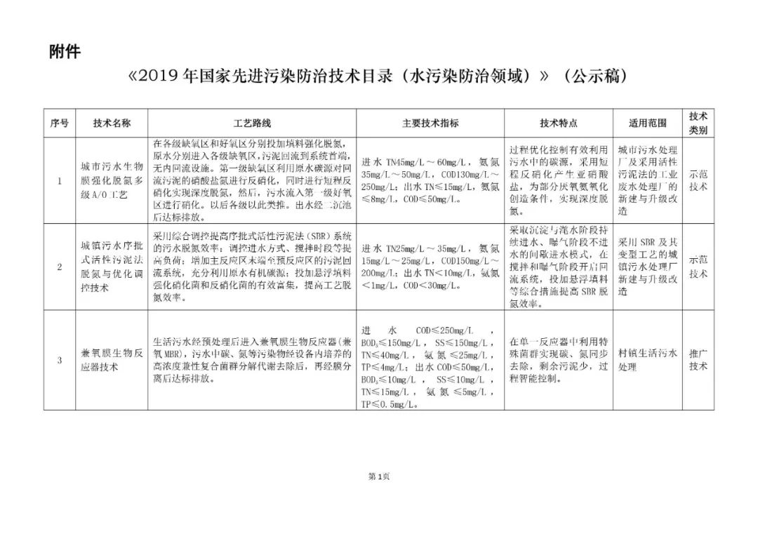 关于《2019年国家先进污染防治技术目录(水污染防治领域)》(公示稿)的公示