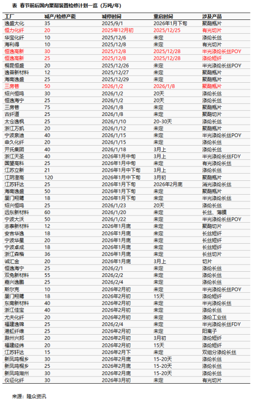 但如果说原油跌了,聚酯工厂就会一下子把涤丝价格降下来,这也很难,其中最重要的原因就是随着聚酯工厂开机负荷的下降,不存在太大的去库压力,尤其是临近春节,聚酯工厂进入检修季,而今年的检修规模预计将高于2025年。