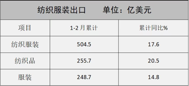 海关数据显示,今年1~2月,全国纺织品服装累计出口额为504.5亿美元,同比增长17.6%,较上年同期增速回升22.1个百分点。其中,纺织品出口额为255.7亿美元,同比增长20.5%,延续去年以来的良好增长态势;服装出口额为24...